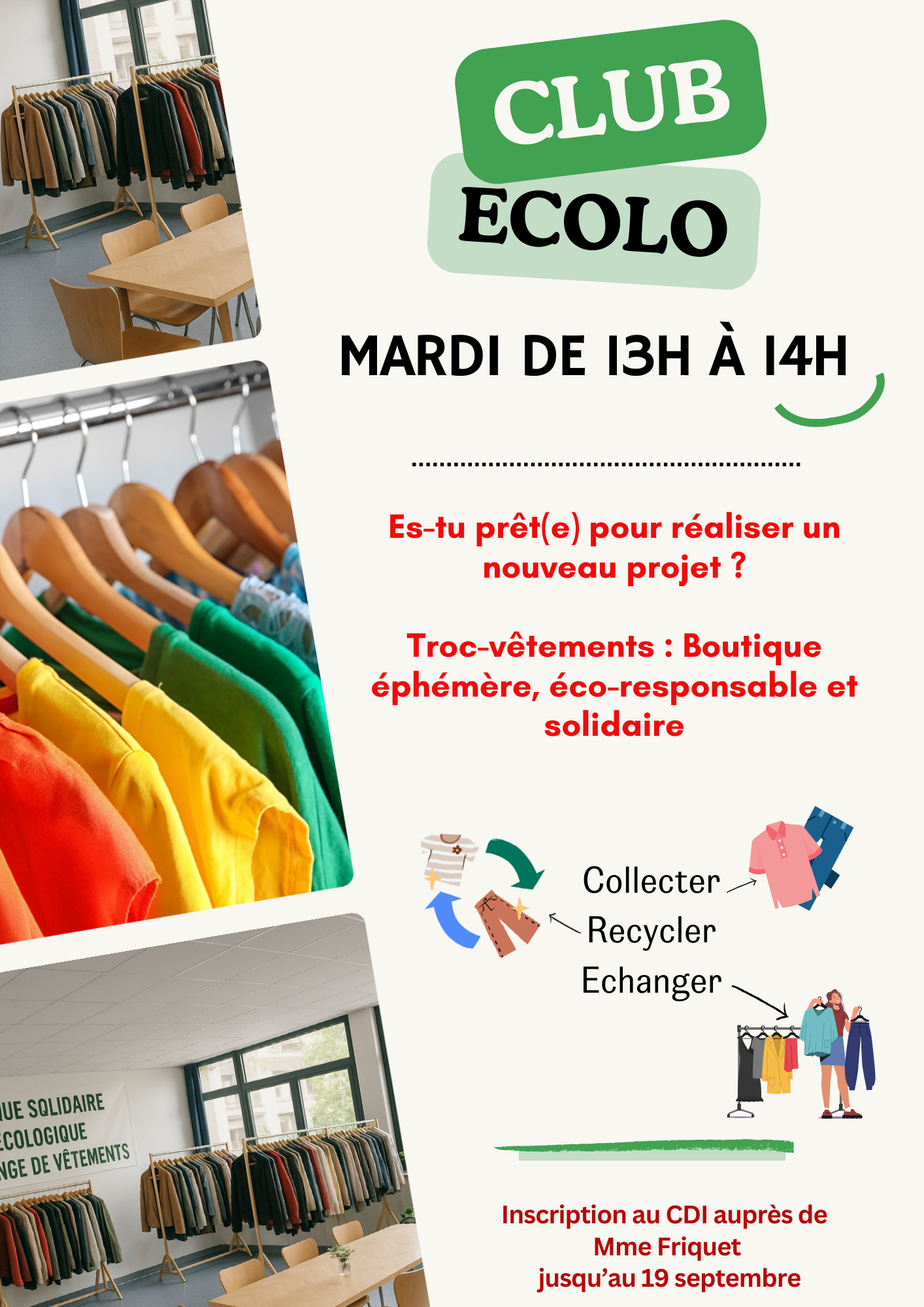 Le Club Ecolo aura lieu les mardis de 13h à 13h55. Un nouveau projet sera mis en place cette (...)
