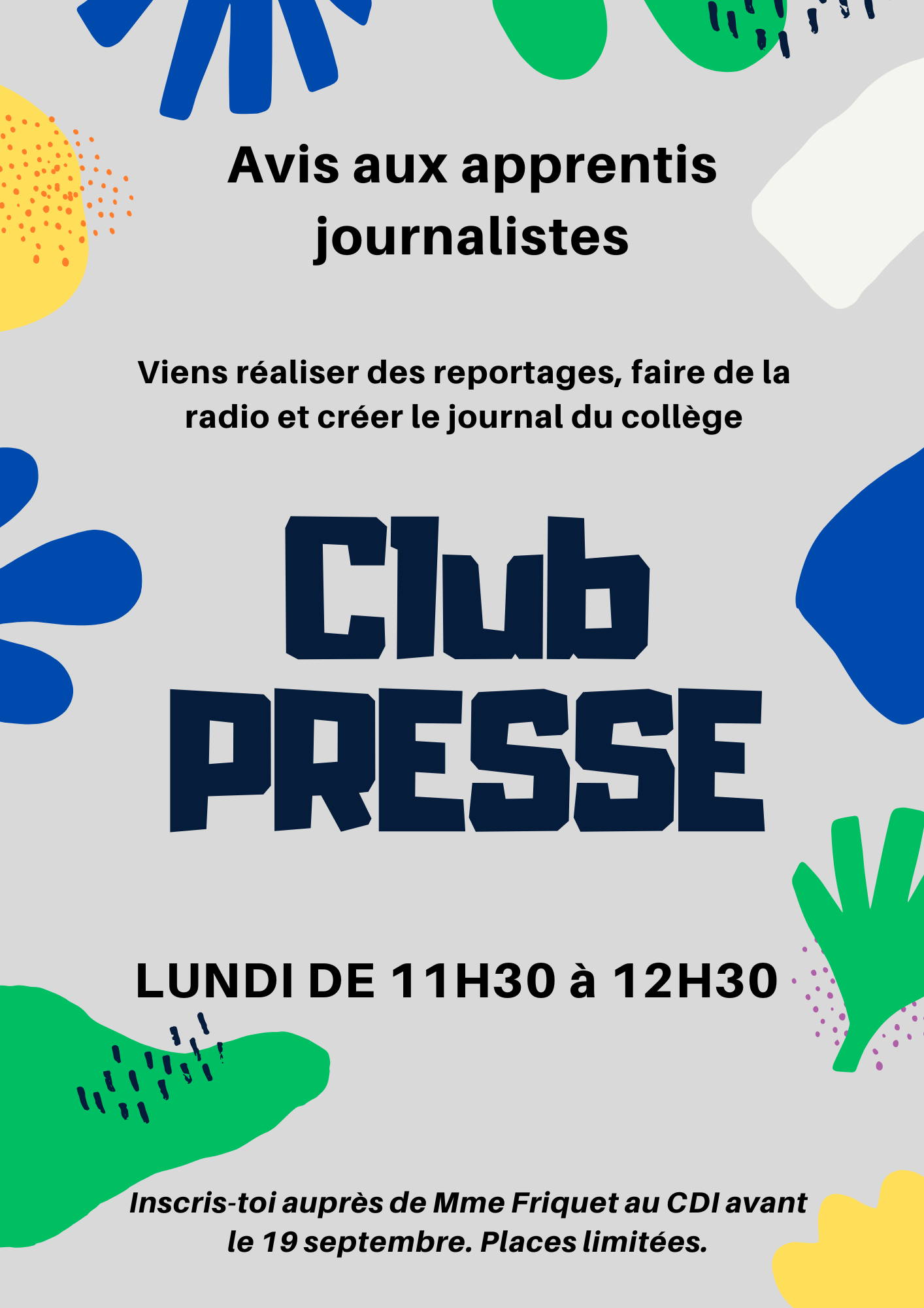Le Club Presse a lieu les lundis de 11h30 à 12h25 Les élèves du club Presse réalisent des (...)
